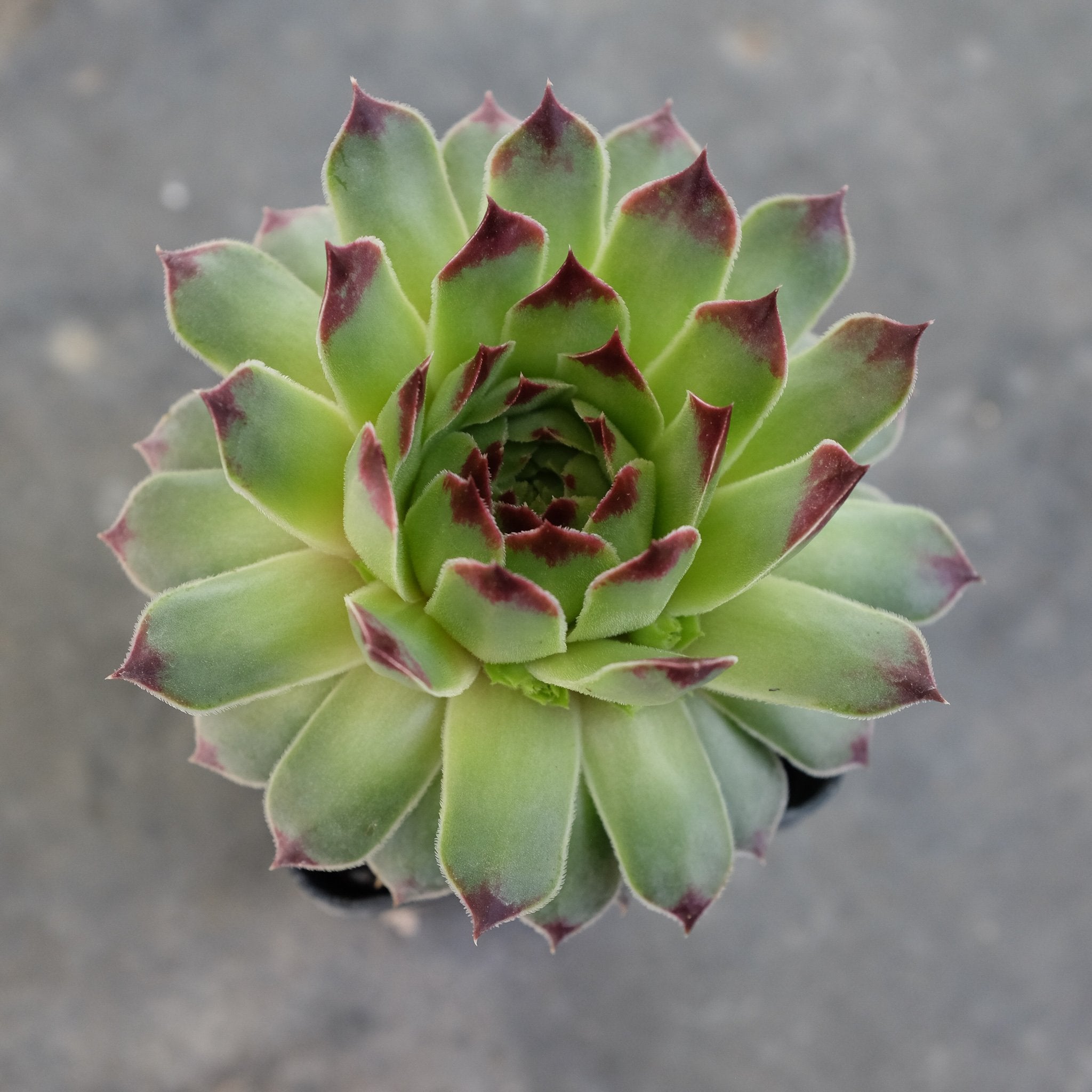 Mat-forming succulent that features light green foliage with striking burgundy tips. Rosettes grow up to 6" tall with a spread of 1'-2' and prefer full sun exposure in well-drained soil. Central "hen" rosettes will send out offsets or "chicks" that will fill in empty spaces when the parent rosettes die. Does well in rock gardens and shallow, gravelly soil. Very drought tolerant.