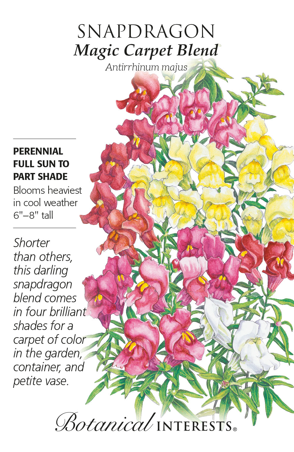 If you love "snaps" you'll want to grow this dwarf variety of the old garden favorite. With a lovely combination of colors, it adds charm when planted with other low-growing annuals in flower beds and borders. The perfect size for containers, or even hanging baskets, and attract pollinators. The edible flowers with their unique shape make an interesting and pretty garnish on salads, desserts, and cold drinks. Snaps do best in cool weather. A good cut flower for your petite bouquet.