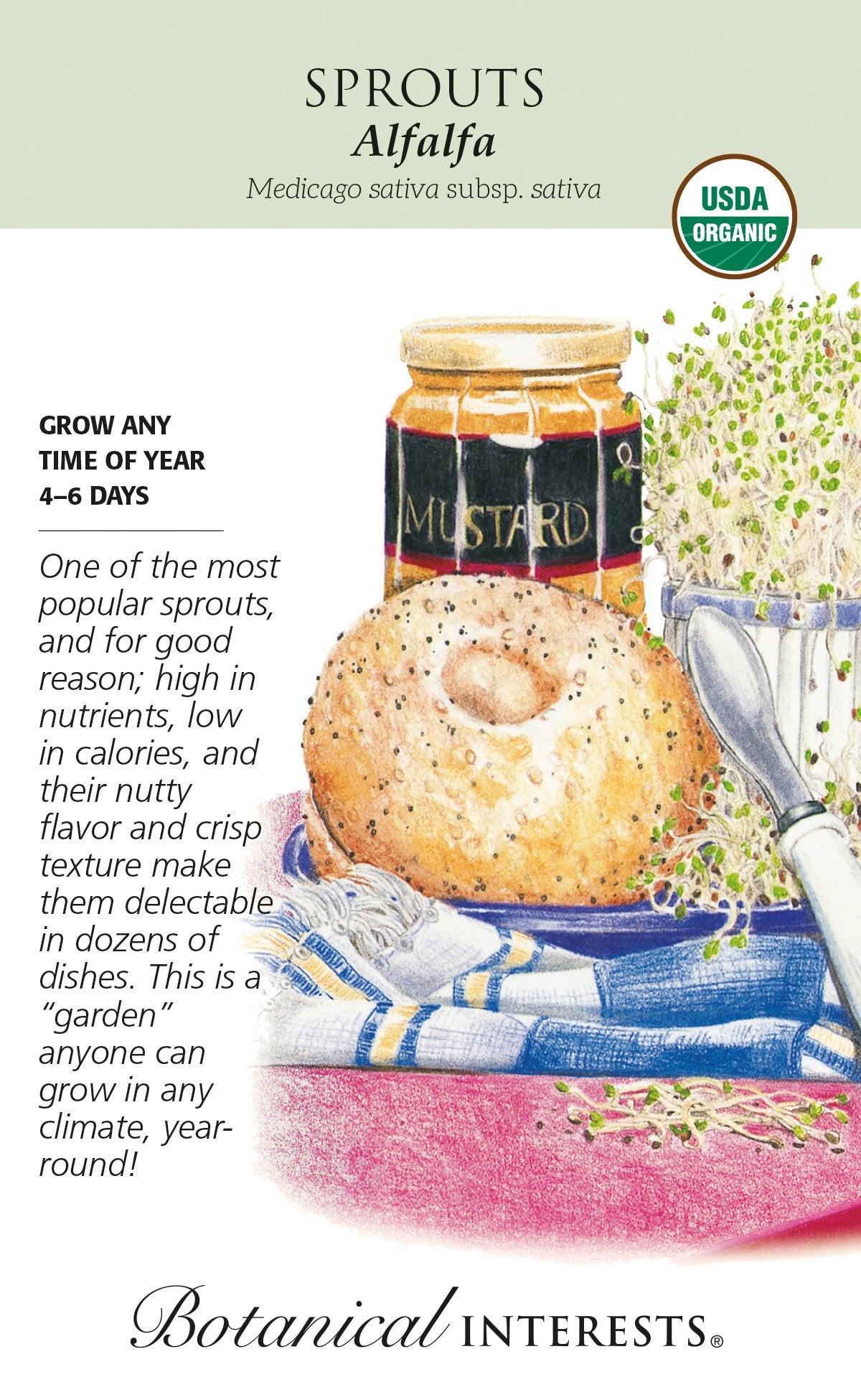 Nutritious, delicious, and easy to grow! High in protein, essential amino acids, digestive enzymes, vitamins, minerals, and (when exposed to light) chlorophyll. Alfalfa sprouts add lively flavor and texture to salads and sandwiches. The culinary possibilities are limited only by your imagination!