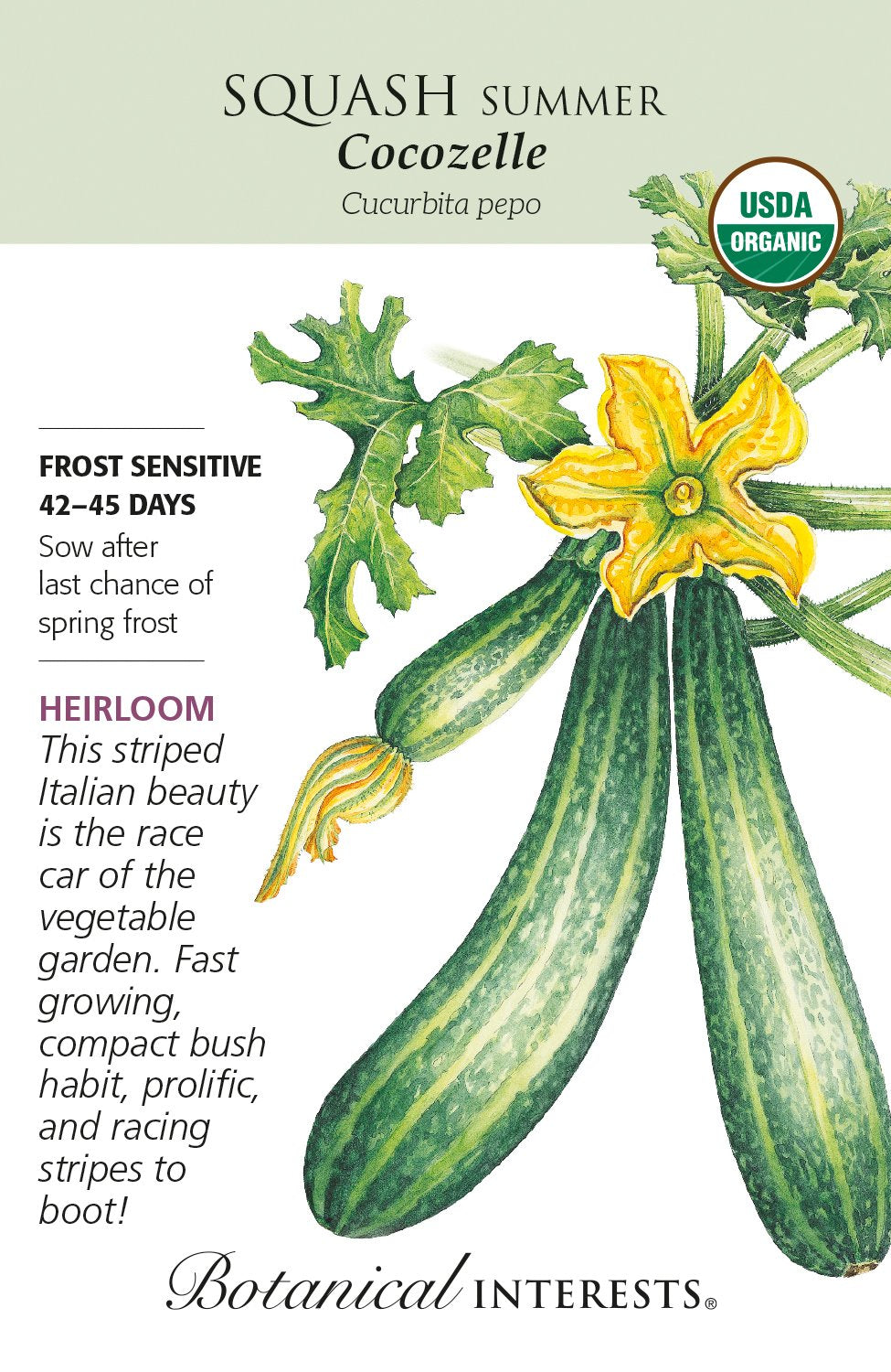 A treasured 1800s Italian heirloom, 'Cocozelle' has very long, dark green fruit with light green vertical stripes. Also called 'Cocozella di Napoli', it is a compact bush type plant that can be grown in any sunny spot in the garden or in a large container. Italians traditionally harvest summer squash when very young, about finger size. See inside of packet for cooking ideas and recipe.