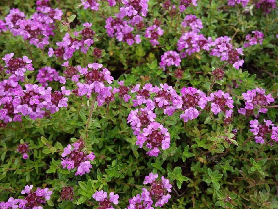 Creeping variety of thyme that produces bright pink flowers in the summer. Plants grow to a height of 3" with a spread of 3"-12" and prefer full sun exposure in well-drained soil. Pollinator friendly; works well in rock gardens and between paving stones.