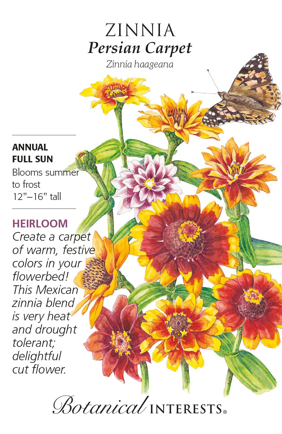 Persian Carpet, also called Mexican zinnia or narrow-leaved zinnia, is a reliable choice for beds, borders, and containers. With bicolored single and double flowers in gold, burgundy, cream, red, and orange, it will bloom throughout hot, dry summer weather until first frost. It has smaller, narrower leaves and a more bushy, compact habit than common zinnia (Z. elegans). Delightful as a cut flower; attracts pollinators, too! 1952 All-America Selections winner.